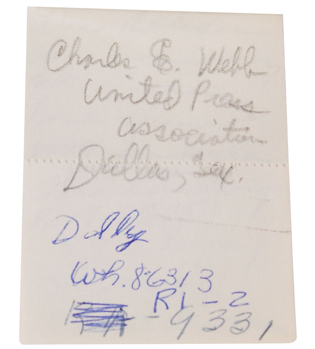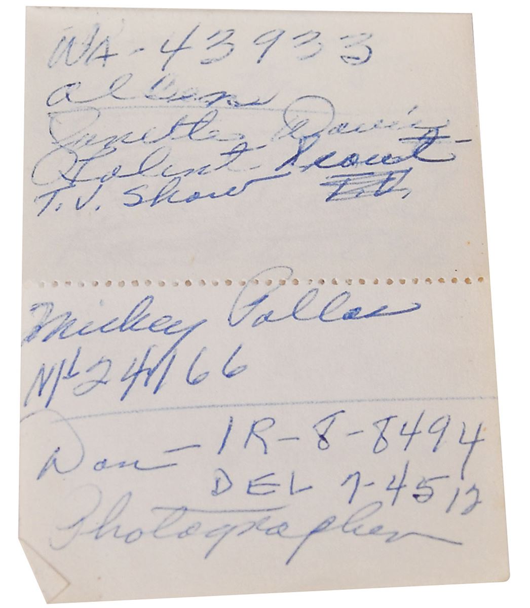 Jack Ruby’s pocket notepad, twenty pages, 2.25 x 3.75, circa 1956. Each page is perforated at the center, with some of the lower halves absent. The pad is copiously filled out in pencil and ballpoint with notes in Ruby’s hand, including names, addresses and phone numbers, expenses, personal and business contacts, and various other information. Some notes include: “Janette Davis, Talent Search TV Show”; “Johnny Ray”; “Pay rent, Stanley Kaufman, Pay rent apt”; “Charles E. Webb, United Press Association, Dallas, Tex”; “Gold Stamping, RI-7-5545”; and “Also 10% of Gross Sales.” In fine condition.