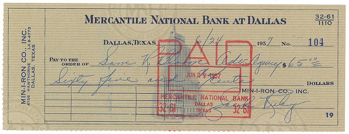 Mercantile National Bank at Dallas check, 8 x 3, filled out and signed by Ruby, payable to Sam R. Bloom Advertising Agency for $65, June 24, 1957. In fine condition.