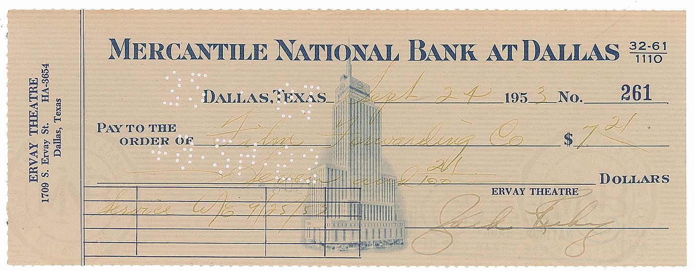 Ervay Theatre business check, 8 x 3, filled out in another hand and signed by Ruby, payable to Film Forwarding Co. for $7.21, September 24, 1953. In fine condition, with all of the writing light but legible.