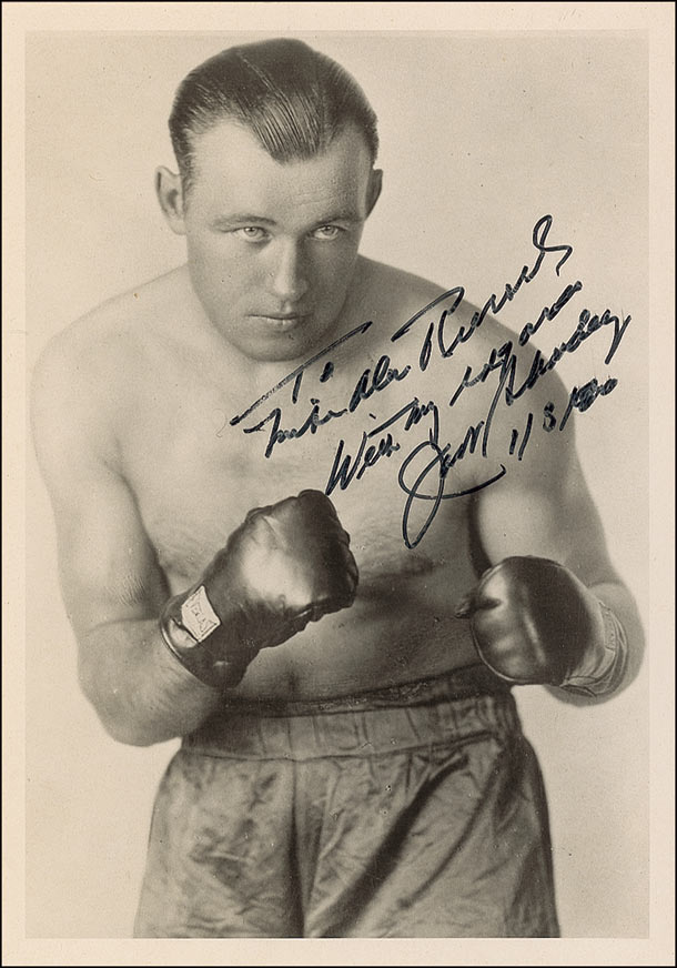 Glossy 5 x 7 photo of Sharkey in a pugilistic pose, signed and inscribed in black felt tip. In fine condition, with a few trivial surface dings.