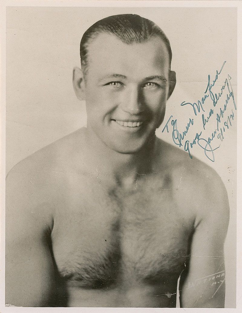 Glossy 7 x 9 photo of Sharkey posing shirtless, signed and inscribed in black felt tip, “To Ernest Manfred, good luck always, Jack Sharkey, 9/18/70.” In fine condition, with some scattered surface creases and various marks inherent to the original negative.