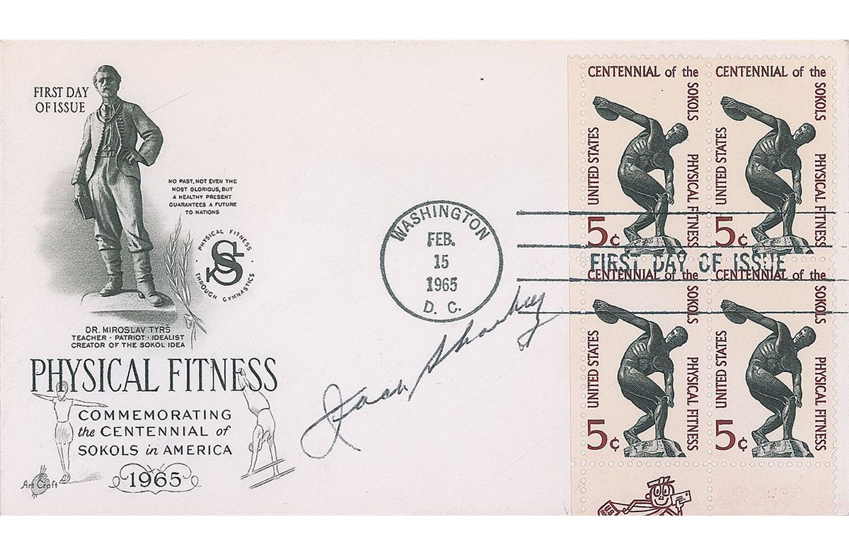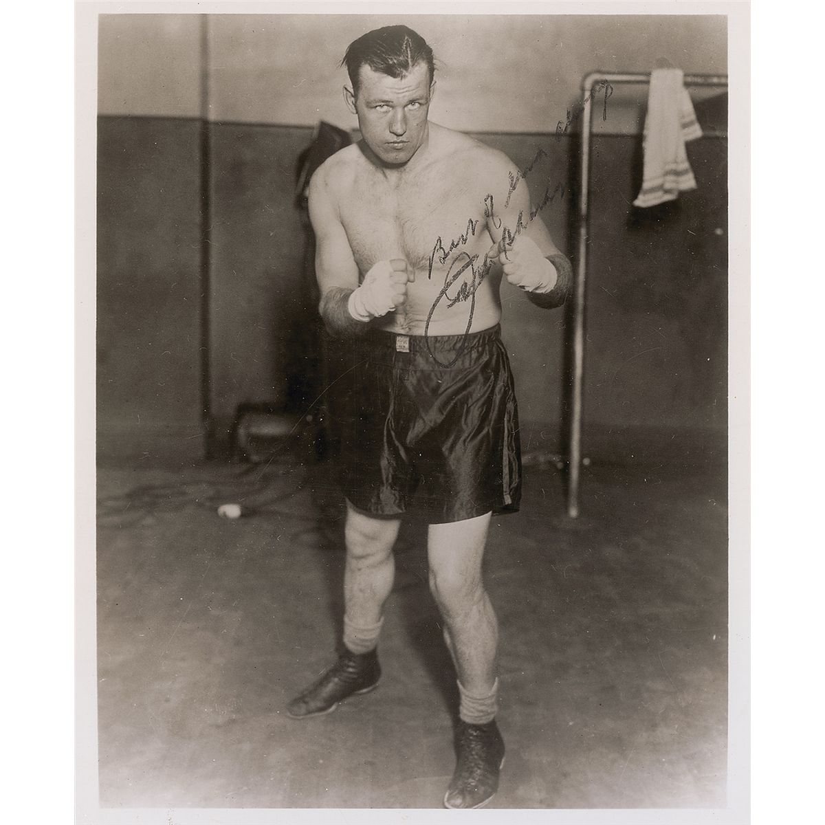 American heavyweight boxing champion (1902–1994). Two items: glossy 8 x 10 photo of Sharkey in the gym, signed in black crayon, “Best of luck always, Jack Sharkey”; and an FDC with a cachet honoring physical fitness, signed in black ballpoint by Sharkey. In fine condition, with surface impressions to the photo from signing another item placed on top.