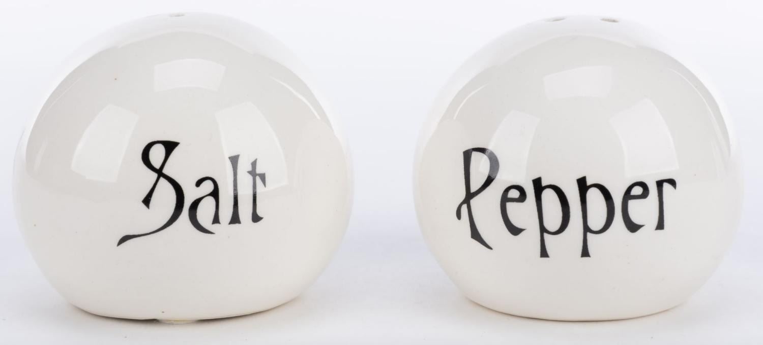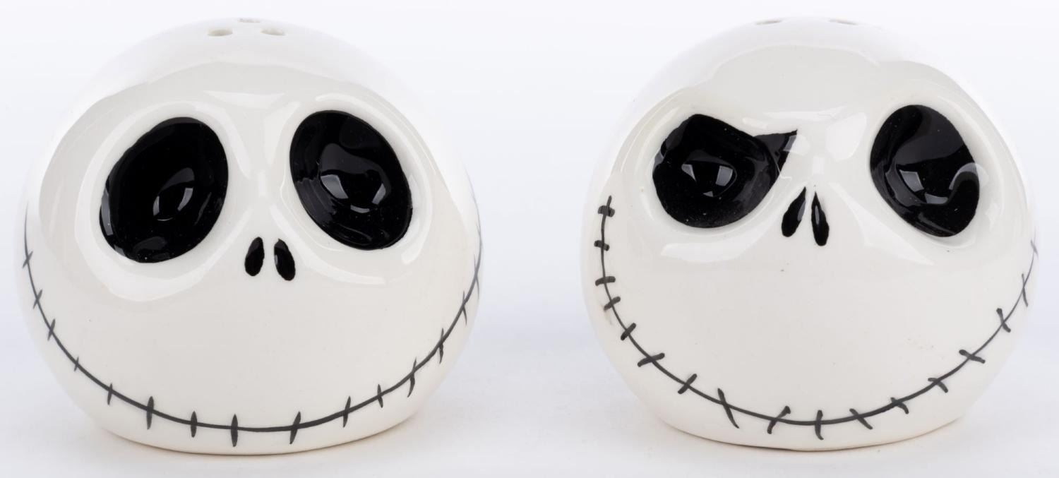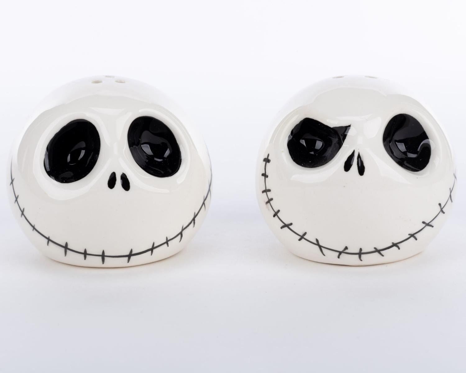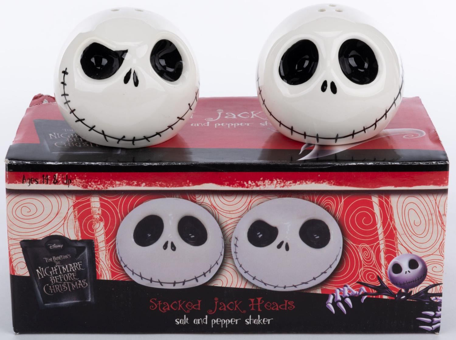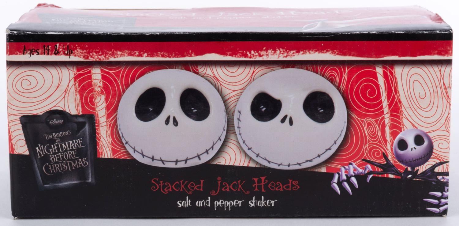(NECA, 2010) A "Stacked Jack Heads" salt & pepper shaker set featuring Jack Skellington from "Tim Burton's The Nightmare Before Christmas." Each shaker measures 2.75" x 3" x 2.5" and is in fine condition with the original 8.25" x 4" x 3.5" box.