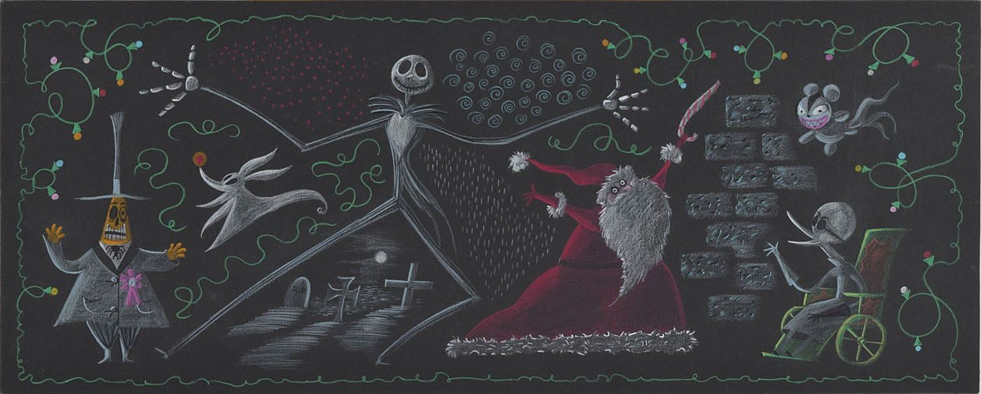 (Walt Disney Studios, 1993) Original storyboard concept drawing of several characters from Tim Burton's animated dark fantasy The Nightmare Before Christmas, depicting characters like Jack Skellington, his ghost dog Zero, Santa Claus, Doctor Finklestein, the Mayor of Halloween Town, and Scary Teddy. Accomplished in pastel and colored pencil on black 21 x 8.5 artist's board. In fine condition. A remarkably imagined and considerably rare concept storyboard featuring six characters from Burton’s classic union of Halloween and Christmas.