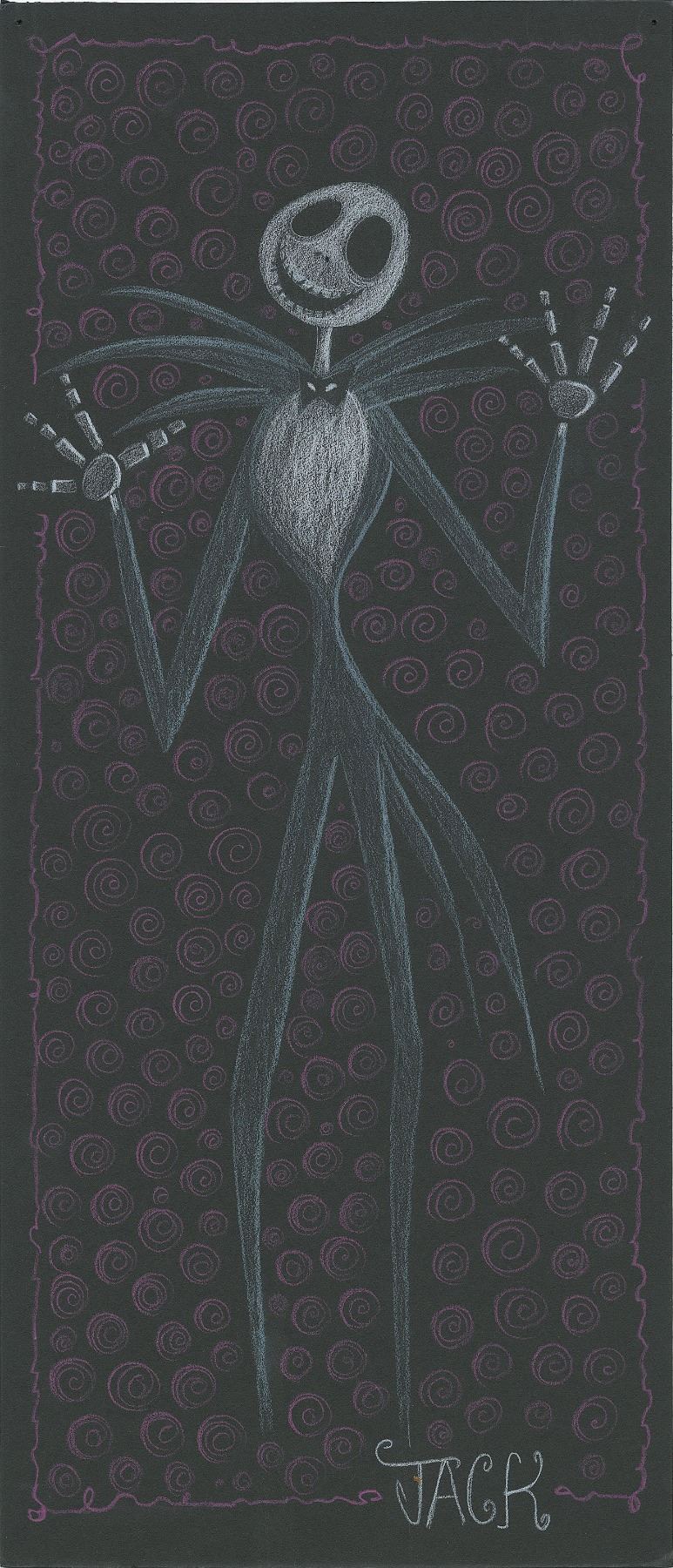 (Walt Disney Studios, 1993) Original storyboard concept drawing of Jack Skellington from Tim Burton's animated dark fantasy The Nightmare Before Christmas, showing the happy-go-lucky ‘Pumpkin King’ in a wonderful full-length pose wearing his trademark Gothic-style tuxedo, with the border and background embellished in purple and the lower section reading in white, “Jack.” Accomplished in pastel and colored pencil on black 6.5 x 18.5 artist's board. In fine condition, with tack holes to upper corners.