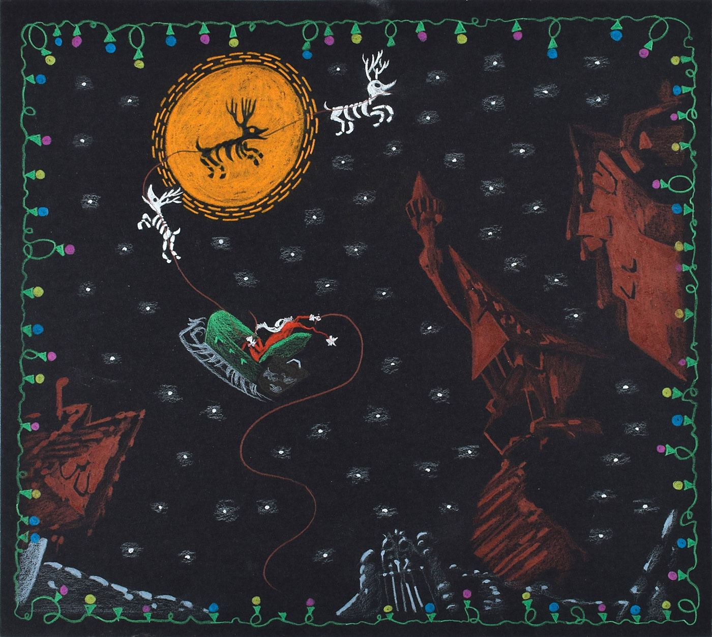 (Walt Disney Studios, 1993) Original storyboard concept drawing of Jack Skellington from Tim Burton's animated dark fantasy The Nightmare Before Christmas, showing Jack dressed as Santa Claus as he soars away from Halloweentown and into a starry and moonlit sky aboard his custom casket-sleigh driven by three skeleton reindeer. Accomplished in pastel and colored pencil on black 11 x 9.75 artist's board. In fine condition. An exceptionally vivid depiction of the moment Jack’s plan to organize Christmas magically takes flight.