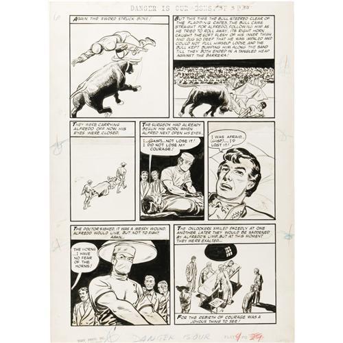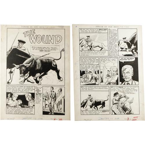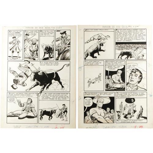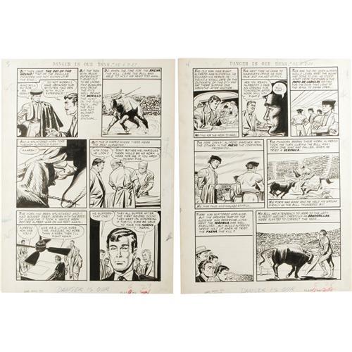 <B>Jack Sparling - Danger Is Our Business #3 Page Original Art, Group of 6 (Toby Press, 1954). </B></I> The <I>muy macho </B></I>sport of bullfighting is detailed in pages 1-6 of the bullfighting thriller, "The Wound." This unique sports story is convincingly illustrated by action-adventure comic book mainstay, Jack Sparling. The image area of each page measures 12" x 18", and the art is in Very Good condition. <BR><BR><b>Shipping:</b> Flat Material, Large (<a target="_blank" href="http://www.heritageauctions.com/common/shipping.php">view shipping information</a>)