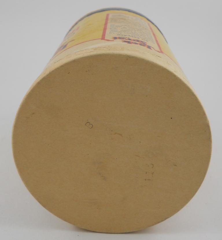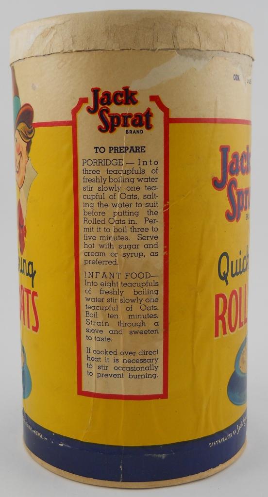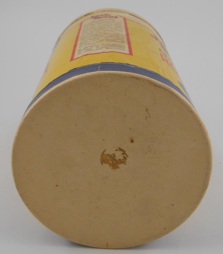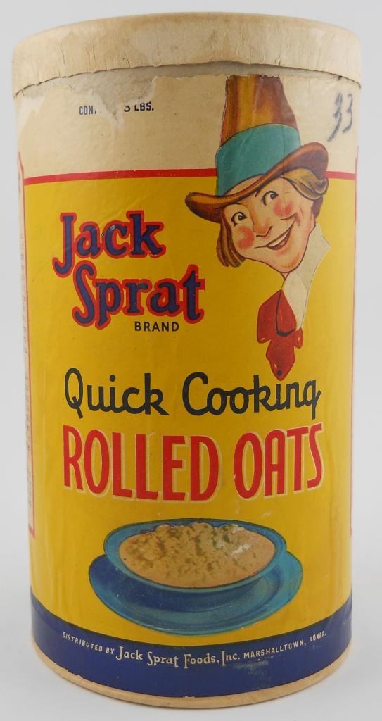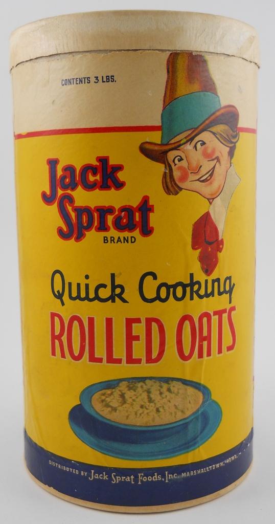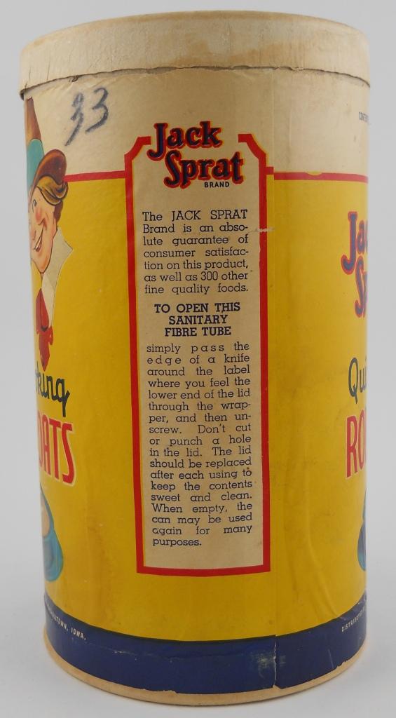 The container has Jack Sprat on both sides and was distributed by Jack Sprat Foods Inc.,of Marshalltown, Iowa. This container is pressed cardboard with a paper label. It is 9-½ inches tall x 5-½ inches in diameter.It is in good condition, with no dents or holes, just some paper loss around the top where the lid was opened.
