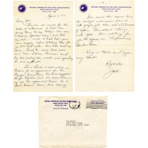 <B>Jack Swigert Autograph Letter Signed</B></I> "<I>Jack,</B></I>" two pages, 5.25" x 8", separate sheets. NASA, Houston, Texas, April 5, 1971. To Joe Garino, in part "<I>Thanks so much for the bottle of vitamins. I have been giving them to my Father...Tried to work last week at a Crew Station Review and by the end of the week was operating on one cylinder. Gave Gordo </B></I> Gordon Cooper <I> a call while in Miami for an appearance for the Olympic Committee...Still much the same here the budget indecision hasn't let people get the old enthusiasm of before...</B></I>" A year earlier, Swigert was Command Module pilot on Apollo 13. After the rupture of the service module oxygen tank on board on April 13, 1970, the Command Module's normal supply of electricity, light, and water was lost. Apollo 13 was about 200,000 miles from Earth. Jack Swigert saw a warning light that accompanied the explosion, and said, "Houston, we've had a problem here." Swigert was elected to Congress in 1982, but died a week before he was to be sworn in. With original envelope. <I>From the collection of renowned former physical trainer of the astronauts Joe Garino. This lot is accompanied by a signed certificate of authentication from Garino verifying its provenance.</B></I><BR><BR><b>Shipping:</b> Flat Material, Small (<a target="_blank" href="http://www.heritageauctions.com/common/shipping.php">view shipping information</a>)