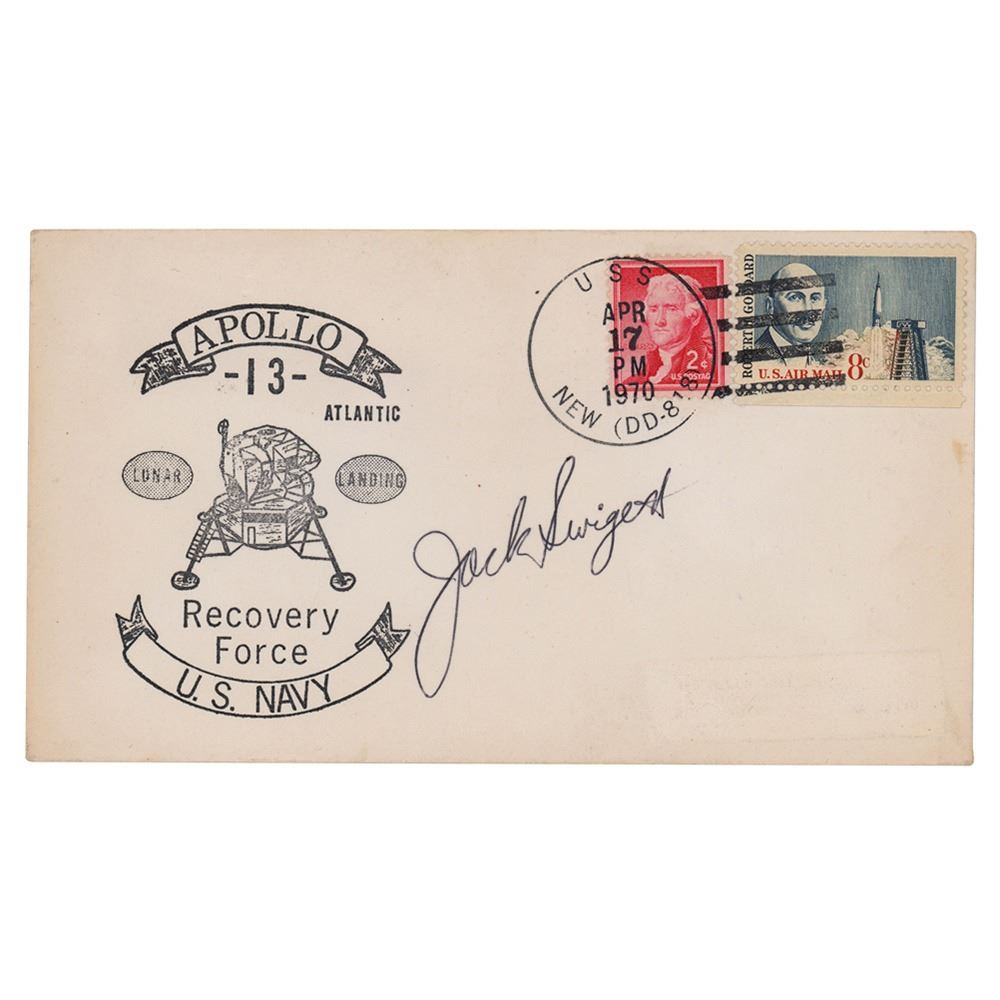 Desirable recovery cover with a cachet honoring the US Navy recovery force for Apollo 13, postmarked onboard the USS New on April 17, 1970, signed in black ballpoint by Jack Swigert. In fine condition. Although the Apollo 13 astronauts were ultimately picked up in the South Pacific by the USS Iwo Jima, USS New was part of the recovery force.