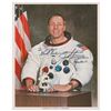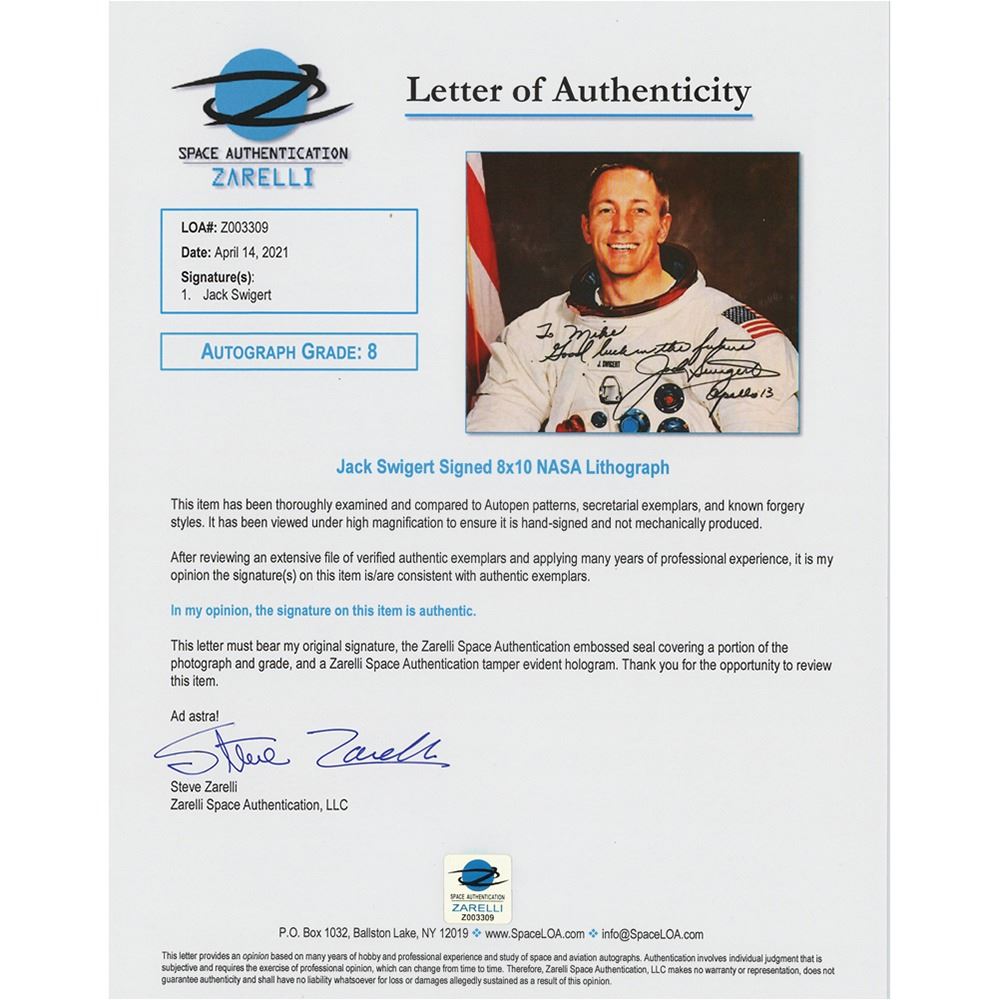 Official color 8 x 10 NASA lithograph of Swigert in his white space suit, signed and inscribed in black felt tip, "To Mike, Good luck in the future, Jack Swigert, Apollo 13.†In fine condition, with a few small surface creases. Accompanied by a full letter of authenticity from Zarelli Space Authentication, grading the autograph as an "8"