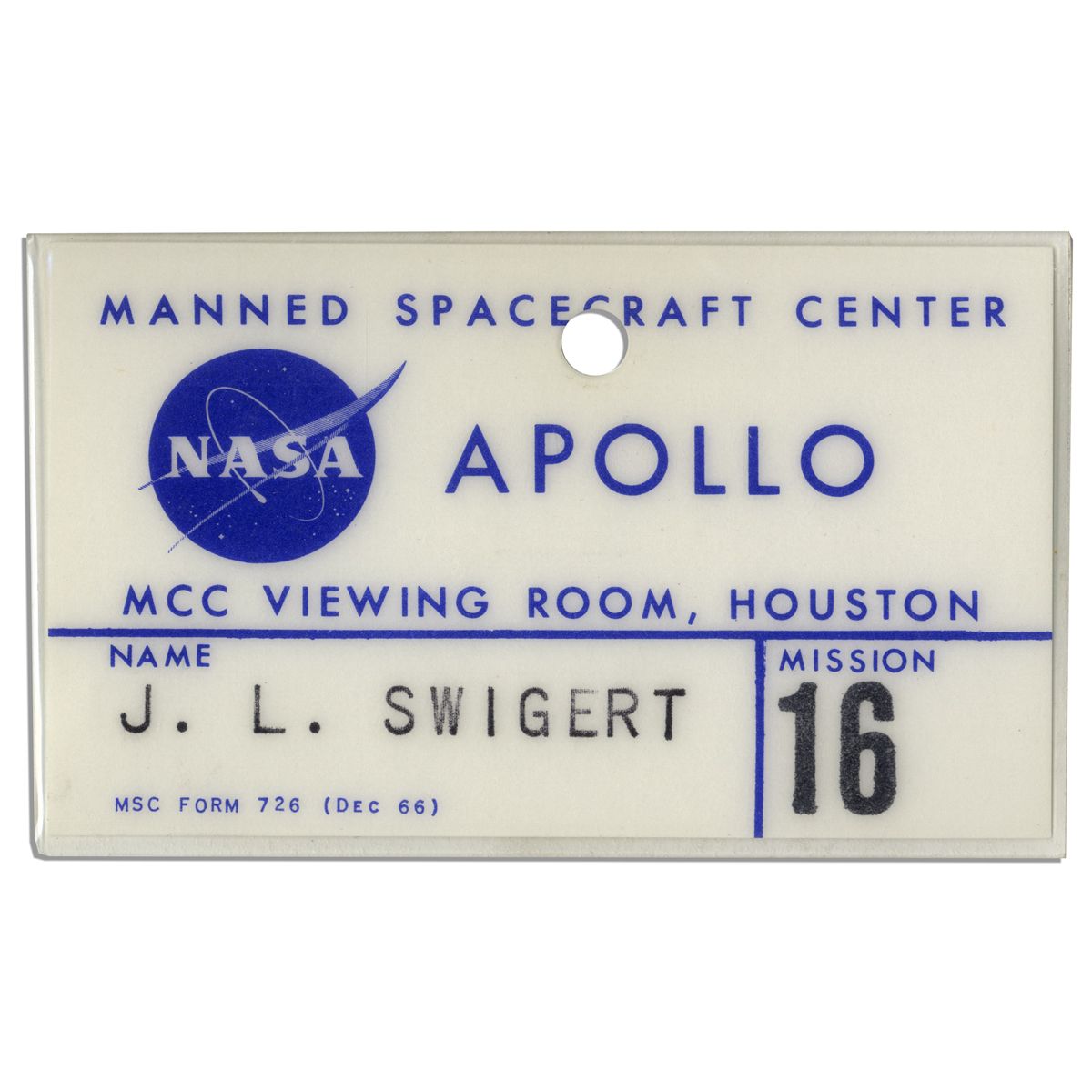 Apollo 16 badge issued to Jack Swigert by NASA. Printed badge bears the NASA logo and Apollo name under the heading ''Manned Spacecraft Center''. Pass is to the MCC Viewing Room, Houston. Stamped with ''J. L. Swigert'' and mission number 16. Measures 4'' x 2.25''. Laminated with hole punch to top center. Fine. With an LOA from the Jack Swigert Estate.