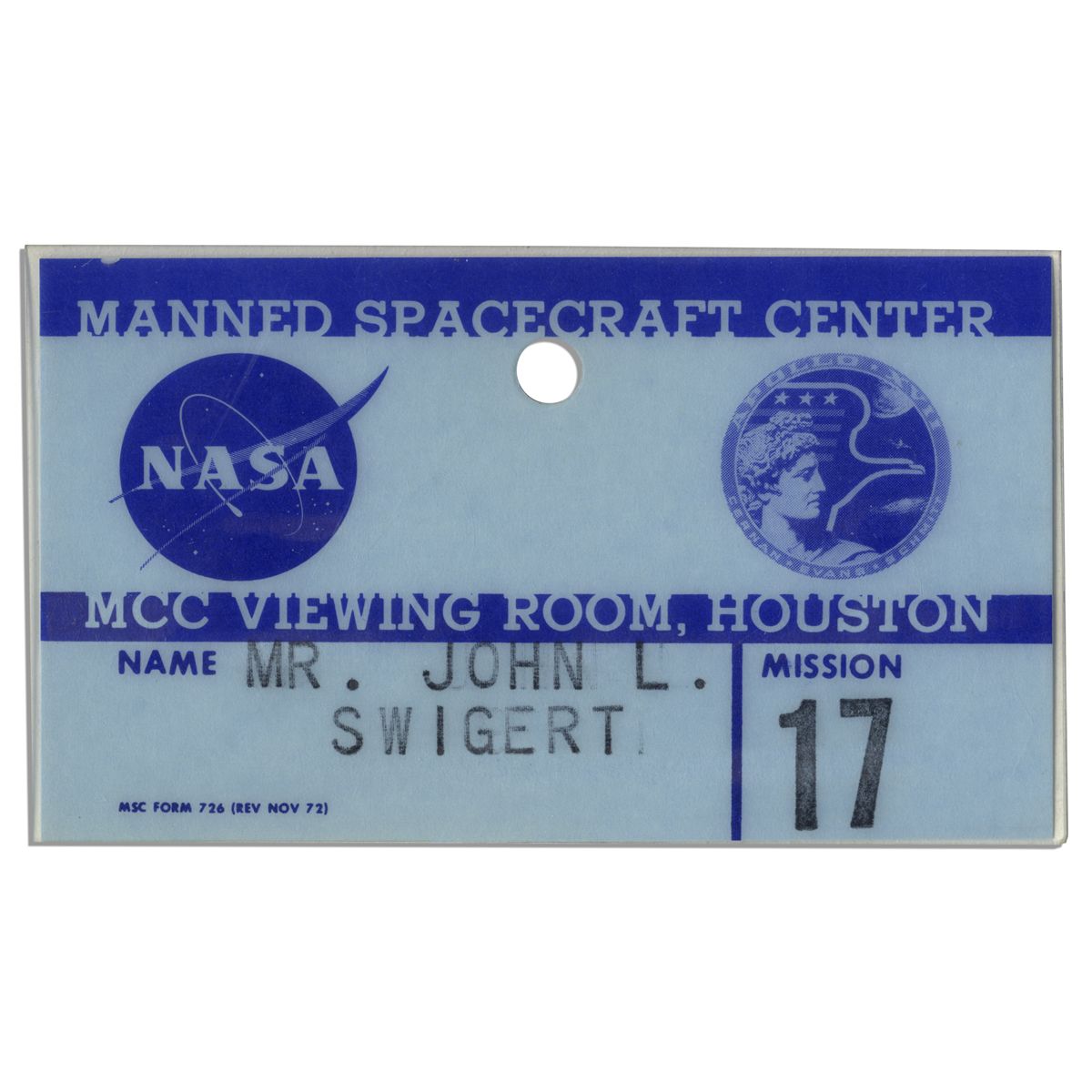 Apollo 17 badge issued to Jack Swigert by NASA. Printed badge on blue paper bears the NASA logo and Apollo insignia under the heading ''Manned Spacecraft Center''. Pass is to the MCC Viewing Room, Houston. Stamped with mission number 17. Measures 4'' x 2.25''. Laminated with hole punch to top center. Fine. With an LOA from the Jack Swigert estate.
