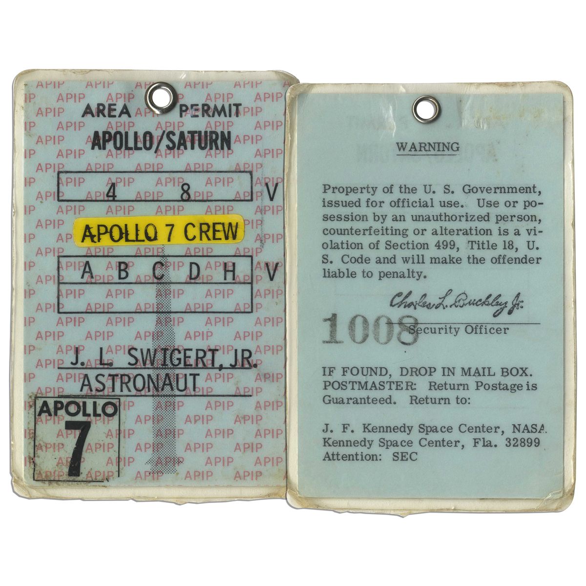 Jack Swigert's Apollo 7 crew badge. Printed pass on blue paper is labeled ''Apollo 7 Crew'' in yellow and names Jack Swigert as ''Astronaut''. Laminated pass measures 2.5'' x 4''. Some separation to edges of lamination, else near fine. With an LOA from the Jack Swigert estate.