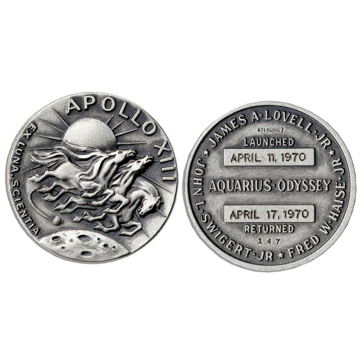 Apollo 13 flown Robbins medal, serial number 147. As the Apollo 13 mission encountered a wide array of problems and complications after being launched, though returning home safely, the original medals were melted down and a new set was made from them. This is one of the new coins made from the so-called ''flown medal'' and is one of 404 newly-designed medals. Coin depicts various mission insignia, including the name of the mission, three of Apollo's chariot horses flying toward the Moon, and the slogan ''Ex Luna, Scientia'' (''from the moon, knowledge''). Verso of coin lists the crew members, space modules, and engraved dates of launch and return, as well as the serial number and the sterling and Robbins hallmarks. Coin measures 1.25'' and is made of sterling silver, housed in its original ''Robbins Company'' plastic box with an ''147'' sticker on the bottom. Fine. With an LOA from Apollo 13 astronaut Jack Swigert's sister.