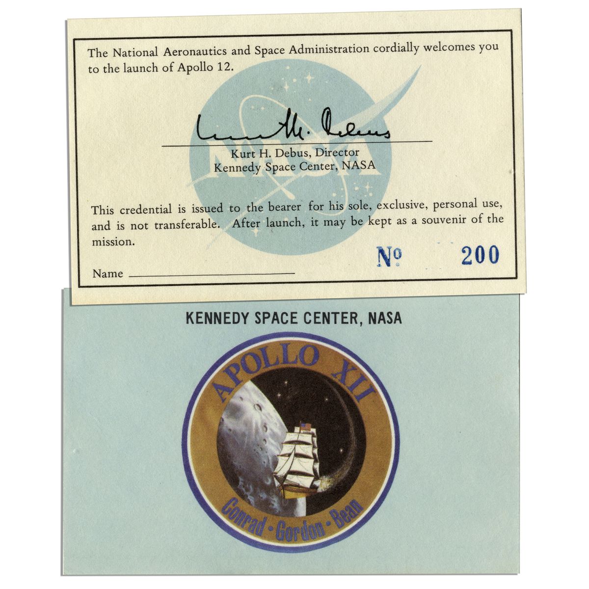 Jack Swigert's ticket to the Apollo 12 launch. Blue ticket features Apollo 12 mission insignia at center. Verso bears a large NASA logo, serial number 200 and printed text welcoming the bearer to the launch. Signed in print by Kennedy Space Center director Kurt H. Debus. Measures 4'' x 2.5''. Fine. With an LOA from the Jack Swigert estate.