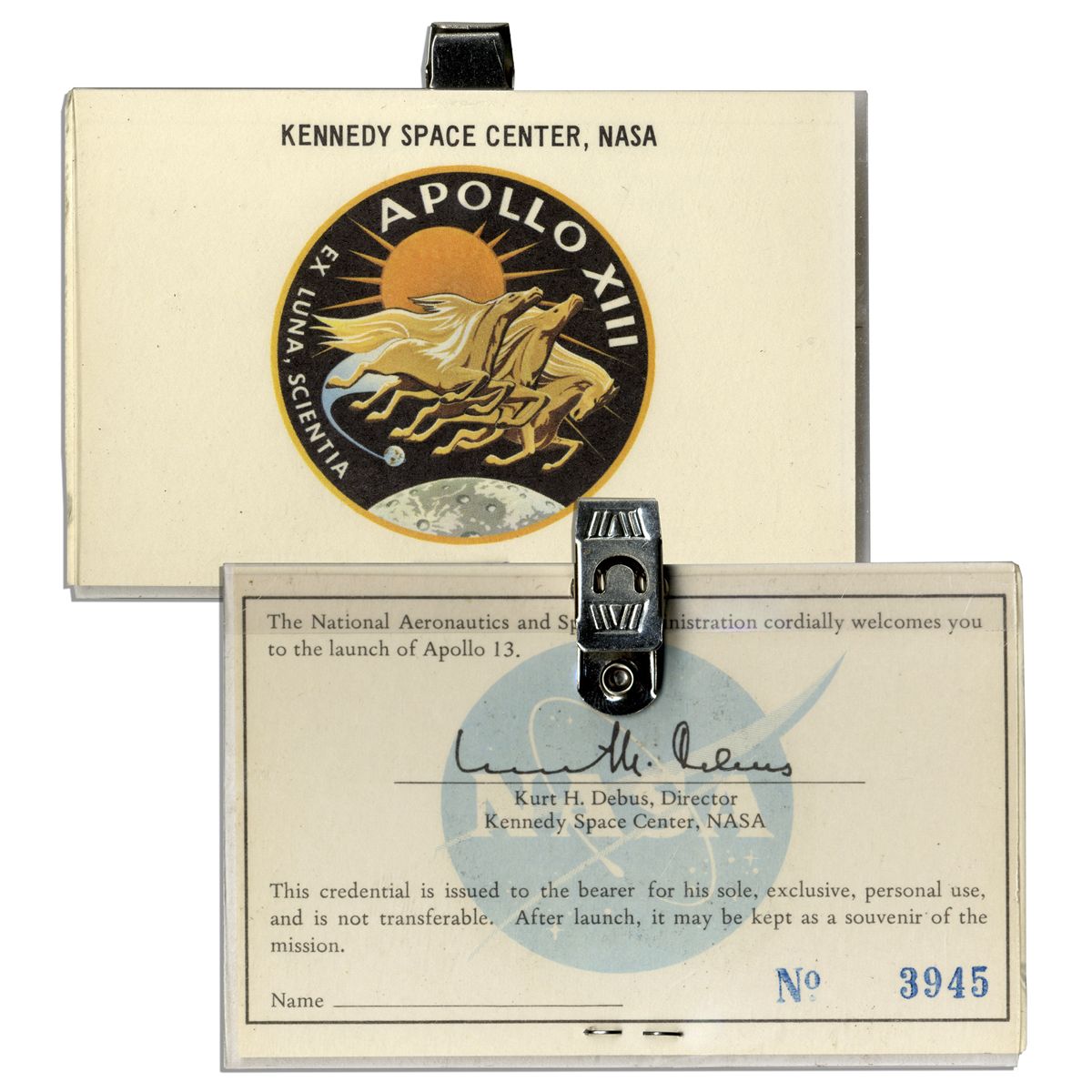 Jack Swigert personally owned ticket to the Apollo 13 launch. Swigert served as Command Module Pilot on Apollo 13, the thrilling near-fatal mission that had to turn back before reaching the moon. Ticket features the Apollo 13 mission insignia at center. Verso bears a large NASA logo, serial number 3945 and printed text reading, ''The National Aeronautics and Space Administration cordially welcomes you to the launch of Apollo 13...'' Signed in print by Kennedy Space Center director Kurt H. Debus. Measures 5'' x 3''. Housed in a clear badge holder with metal clip for affixing to clothing and secured with a staple at the bottom, else near fine. With an LOA from the Jack Swigert estate.