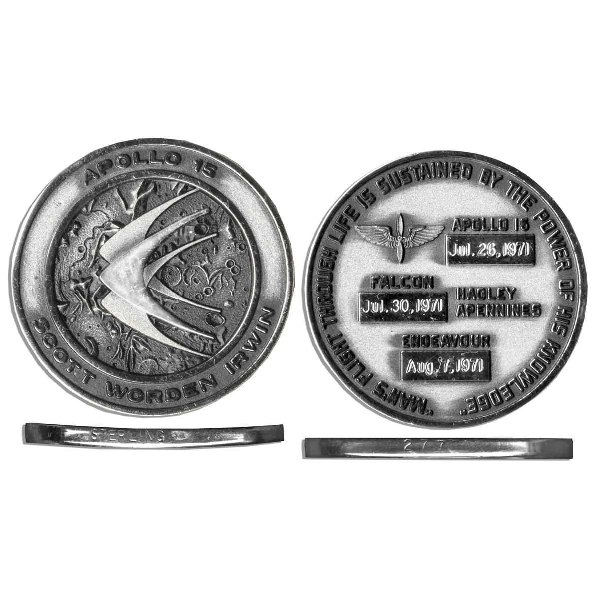 Apollo 15 unflown Robbins Medal, serial number 277, one of 304 minted. Due to a misprint of the word ''apennines'' on reverse side, most (177) of the medals were sent back to the manufacturer and could not be redone before the spacecraft's launch, leaving only the 127 with the correctly printed word to make the flight. Medal features mission insignia of a trio of left-facing flight symbols upon a stylized lunar surface ground. The astronauts' surnames are inscribed to the border underneath and ''Apollo 15'' is inscribed at top center. Reverse features a motto, '''Man's Flight Through Life Is Sustained By The Power Of Knowledge''', surrounding ''Apollo 15 / Falcon / Endeavor'' with dates engraved to fields under each. The name of the mission's landing site on the moon ''Hadley / Appennines'' appears beside the middle item. At upper left is a winged propeller symbol. The rim is engraved ''Sterling'' and with the serial number. Measures nearly 1.5'' in diameter and weighs 20 grams or 0.75 ounces. Scratching to center symbol, else fine. With an LOA from the Swigert estate.