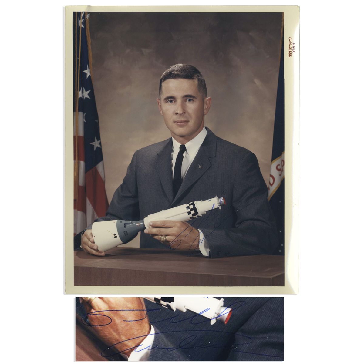 Apollo 8 astronaut Bill Anders signed official NASA photo. Photo depicts Anders posing in a suit and is signed in blue ink across his suit, ''Bill Anders''. Glossy photo measures 8'' x 10'' with slight curling to edges; signature is somewhat hard to see, else near fine. With an LOA from Swigert's sister.