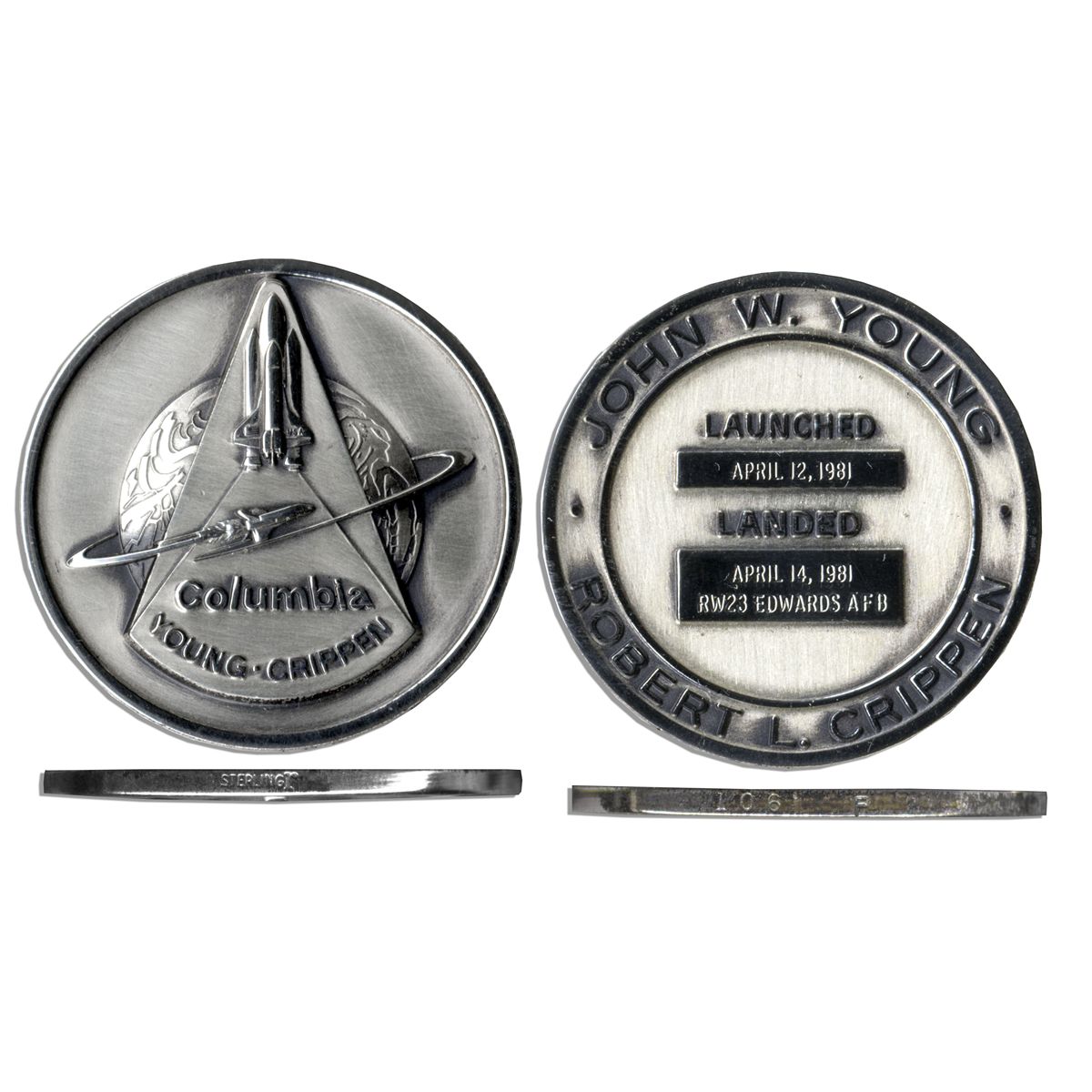 Columbia STS-1 flown sterling silver Robbins medal, serial number 106, as one of only 111 flown and 359 minted. As the first manned, orbital flight in the NASA Space Shuttle missions, the Columbia orbited the Earth 37 times during its 54.5-hour mission which launched on 12 April 1981. Obverse features mission insignia and each astronaut's last name, ''Young / Crippen''. Verso features launch and reentry dates again with each astronaut's full name circumscribed. Serial number ''106F'' is engraved along edge. Housed in original Robbins plastic case with serial number sticker to bottom. Fine. With an LOA from Jack Swigert's sister.