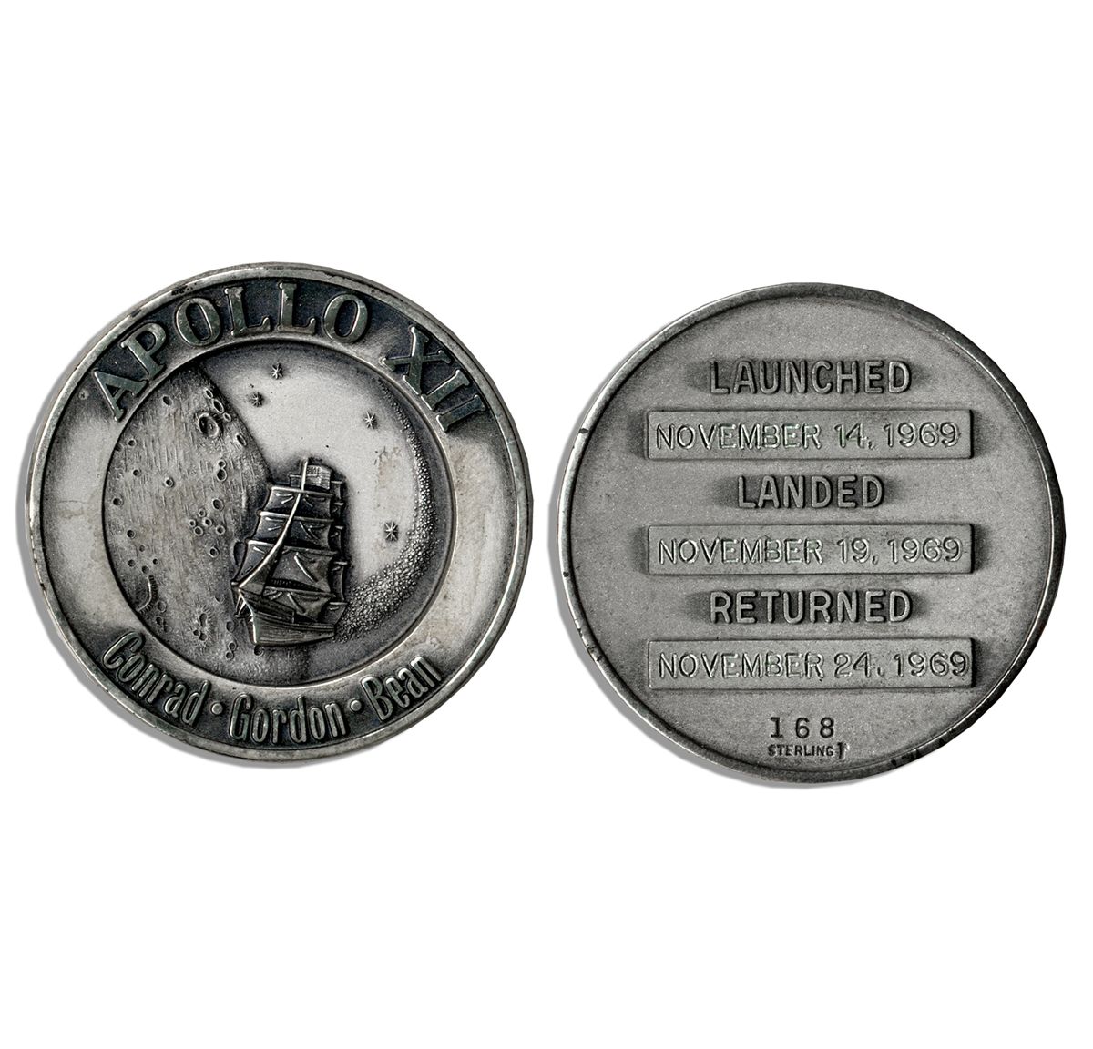 Apollo 12 space-flown Robbins medal, serial number 168. Sterling silver medal was flown onboard the spacecraft as one of just 262 flown. Mission insignia designed for Apollo 12 is a scene set in space, with the moon in the background and a clipper ship in the foreground, chosen in honor of the crew members' background in the Navy. Four stars represent each of the astronauts, including the astronaut killed during training, Clifton Williams. This design is engraved upon the obverse, circumscribed, ''Apollo XII / Conrad - Gordon - Bean''. Reverse is engraved, ''Launched / November 14, 1969 / Landed / November 19, 1969 / Returned / November 24, 1969'', and then the serial number 168 and hallmarks. Measures 1.25'' in circumference with minor tarnishing, else near fine. Comes in original case with ''168'' sticker affixed to verso, denoting serial number. With an LOA from Apollo 13 astronaut Jack Swigert's sister.