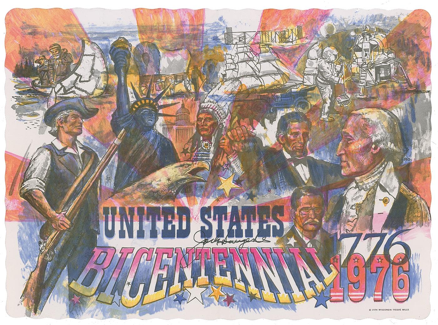 Color United States bicentennial place mat, 14 x 10, signed in black felt tip by Swigert. In fine condition.