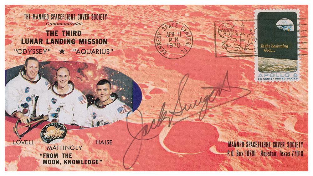NASA astronaut (1931–1982) who, as a last-minute replacement for Ken Mattingly, who had been exposed to German measles, was one of three crew members on the near-disastrous Apollo 13 mission. After leaving NASA, he embarked on a political career, running unsuccessfully for a Senate seat in 1978. He finally won a seat in the House of Representatives in 1982 but died before taking the oath of office. Apollo 13 launch date postal cover with a cachet honoring the crew, signed in black felt tip “Jack Swigert.” In fine condition.