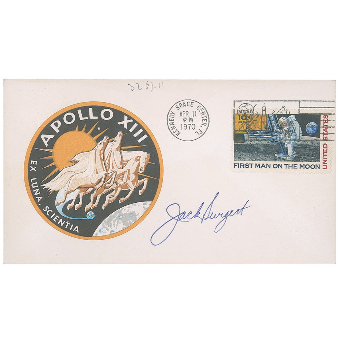 Commemorative cover with a cachet honoring the Apollo 13 mission, signed in blue ballpoint. In fine condition, with small pencil notation along top edge.