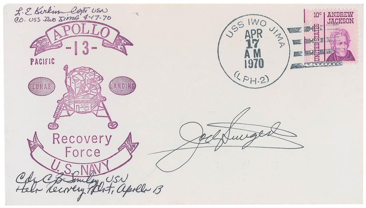 Apollo 13 recovery cover with a cachet honoring the Apollo 13 naval recovery force, signed in black ballpoint by Swigert and also signed by the Commanding Officer of the Iwo Jima and the recovery helicopter pilot. In fine condition.