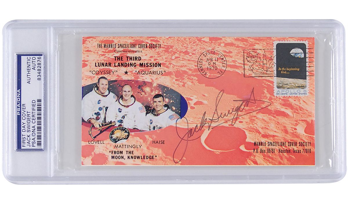 Commemorative cover with a cachet honoring Apollo 13 issued by the Manned Spaceflight Cover Society, signed in black felt tip. Encapsulated in a plastic PSA/DNA authentication holder. In fine condition.