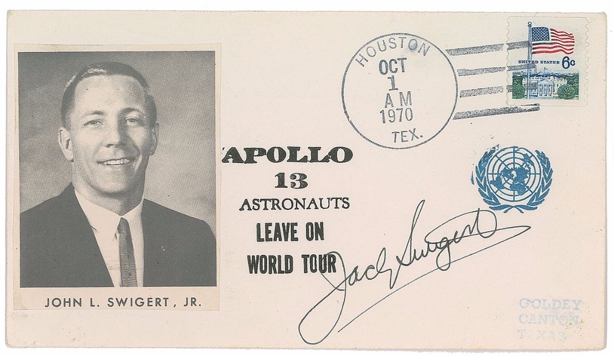Commemorative cover honoring the day the Apollo 13 astronauts departed on their 1970 world tour, bearing an affixed image of CMP Swigert, signed in black ink. In fine condition, with trivial wear and a small tear to lower left corner tip. Accompanied by an unsigned Apollo 13 mission patch.