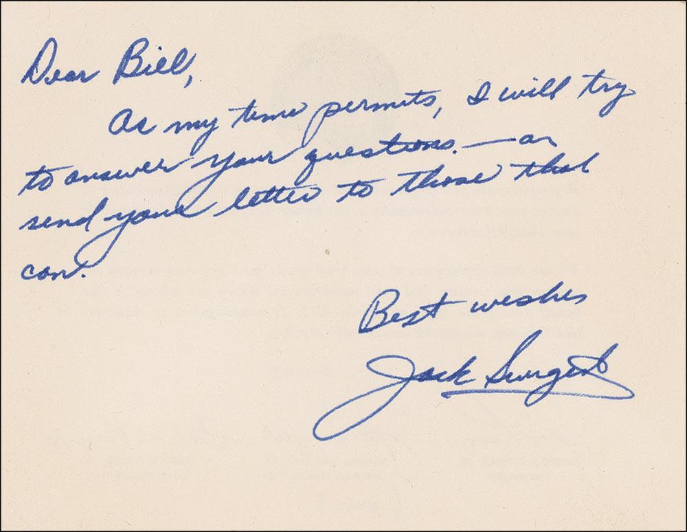Swigert was one of three astronauts aboard the Apollo 13 moon mission, which was aborted after the rupture of an oxygen tank on the spacecraft’s service module. Swigert and fellow astronauts James A. Lovell, Jr., and Fred W. Haise, Jr., returned safely to earth on April 17 after approximately 5 days and 23 hours in space. He later became staff director of the Committee on Science and Technology of the U.S. House of Representatives. Elected to Colorado’s newly created Sixth Congressional District in 1982, he died on December 27, 1982, before taking office. Rare ALS, one page, 5.5 x 4.25, no date. Short letter to a space enthusiast. In full: “As my time permits, I will try to answer your questions—or send your letter to those that can.” Accompanied by the original mailing envelope. In very fine condition. Pre-certified Scott Cornish and RRAuction COA.