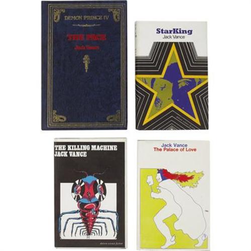 <B>Jack Vance. The First Four First Editions from the Demon Princes Series, One Signed</B></I>, including: <B><I>Star King</B></I></B></I>. London: Dennis Dobson, [1966]. First UK edition. Octavo. 158 pages. Publisher's deep brown cloth with silver titles. In original pictorial dust jacket. Light shelf wear, else fine condition. [and:] <B><I>The Killing Machine</B></I></B></I>. London: Dennis Dobson [1967]. First UK edition. Octavo. 158 pages. Publisher's deep brown cloth with silver spine titles. In original pictorial dust jacket. Minor edge wear to the dust jacket spine, else fine. [and:] <B><I>The Palace of Love</B></I></B></I>. London: Dennis Dobson, [1968]. First UK edition. Octavo. 189 pages. Publisher's deep brown cloth with silver titles. In original pictorial dust jacket. Light shelf wear and rubbing to dust jacket, else fine condition. [and:] <B><I>The Face</B></I></B></I>. San Francisco, California and Columbia, Pennsylvania: Underwood / Miller, 1980. First hardcover edition. One of 150 copies signed by the author on the limitation page bound in front. Fine condition. <I>From the Robert and Diane Yaspan Collection.</B></I><BR><BR><b>Shipping:</b> Books & Catalogs (<a target="_blank" href="http://www.heritageauctions.com/common/shipping.php">view shipping information</a>)