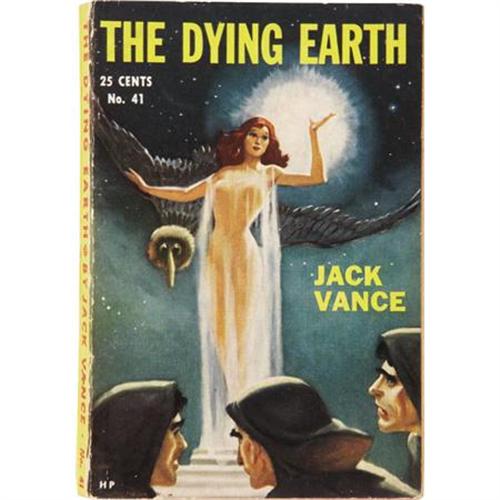 <B>Jack Vance. </B></I><B><I>The Dying Earth</B></I></B></I>. New York: Hillman Periodicals, Inc., [1950]. <BR>First edition. Twelvemo. 175 pages.<BR><BR>Publisher's illustrated wrappers. Textblock detached to page 48, and mild shelf wear, else a very good copy of Vance's first book.<BR><BR>"Six stories from 1950 about Earth in the far future: magic replaces science; population shrinks; the Sun is dying. Yet mankind struggles for survival in tragic heroic mood...Exotic characters and fascinating situations. Well told." (Barron: <I>Anatomy of Wonder</B></I> [1976] 269-270) <I>From the Robert and Diane Yaspan Collection.</B></I><BR><BR><b>Shipping:</b> Books & Catalogs (<a target="_blank" href="http://www.heritageauctions.com/common/shipping.php">view shipping information</a>)