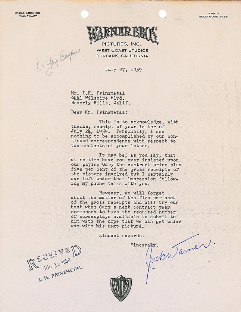 TLS, one page, 8.5 x 11, Warner Bros. letterhead, July 27, 1959. Letter to Gary Cooper’s attorney, I. H. Prinzmetal. In full: “This is to acknowledge, with thanks, receipt of your letter of July 24, 1959. Personally, I see nothing to be accomplished by our continued correspondence with respect to the contents of your letter. It may be, as you say, that at no time have you ever insisted upon our paying Gary the contract price plus five per cent of the gross receipts of the picture involved but I certainly was left under the impression following my phone talks with you. However, we will forget about the matter of the five per cent of the gross receipts and will try our best when Gary’s next contract year commences to have the required number of screenplays available to submit to him with the hope that we can get under way with his next picture.” Pencil notation to the top reads “Cc Gary Cooper.” Light scattered creases and soiling, and two punch holes and light toning to the top, otherwise fine condition.