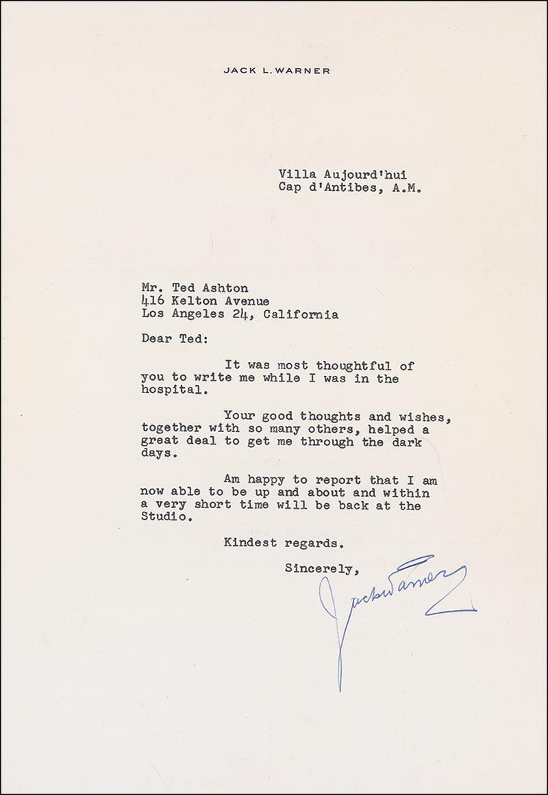 American film executive (1892–1978) who, in 1923, co-founded Warner Brothers studios with three of his brothers. TLS, one page, 7.25 x 10.5, personal letterhead, no date. Letter of thanks to Ted Ashton while recovering from an illness. In part: “Your good thoughts and wishes, together with so many others, helped a great deal to get me through the dark days. Am happy to report that I am now able to be up and about and within a very short time will be back at the Studio.” In fine condition, with intersecting mailing folds, and a few light creases. Ted Ashton, a Princeton graduate, began his motion picture career in 1947 in the publicity department at Warner Brothers. He soon became a unit publicist on many of the studios most successful films for the next 18 years. Among his many credits were Giant, Mister Roberts, Auntie Mame, East of Eden, Calamity Jane, The Green Berets, and Bound for Glory. Pre-certified PSA/DNA and RRAuction COA.