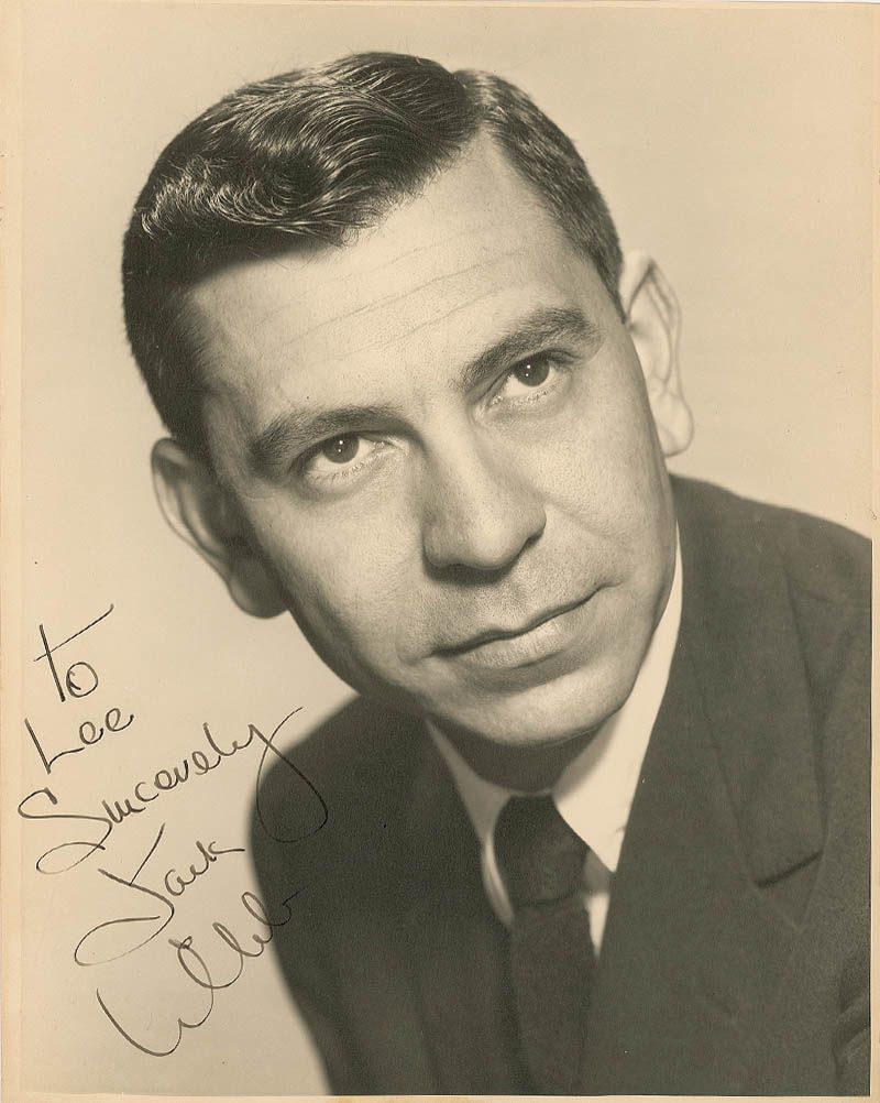 Handsome vintage matte-finish 10.75 x 13.75 head-and-shoulders photo, signed and inscribed in fountain pen “To Lee, Sincerely, Jack Webb.” Slight rippling to the top edge, light silvering to the image, a tack hole to the right border, and trimmed edges, otherwise fine condition.