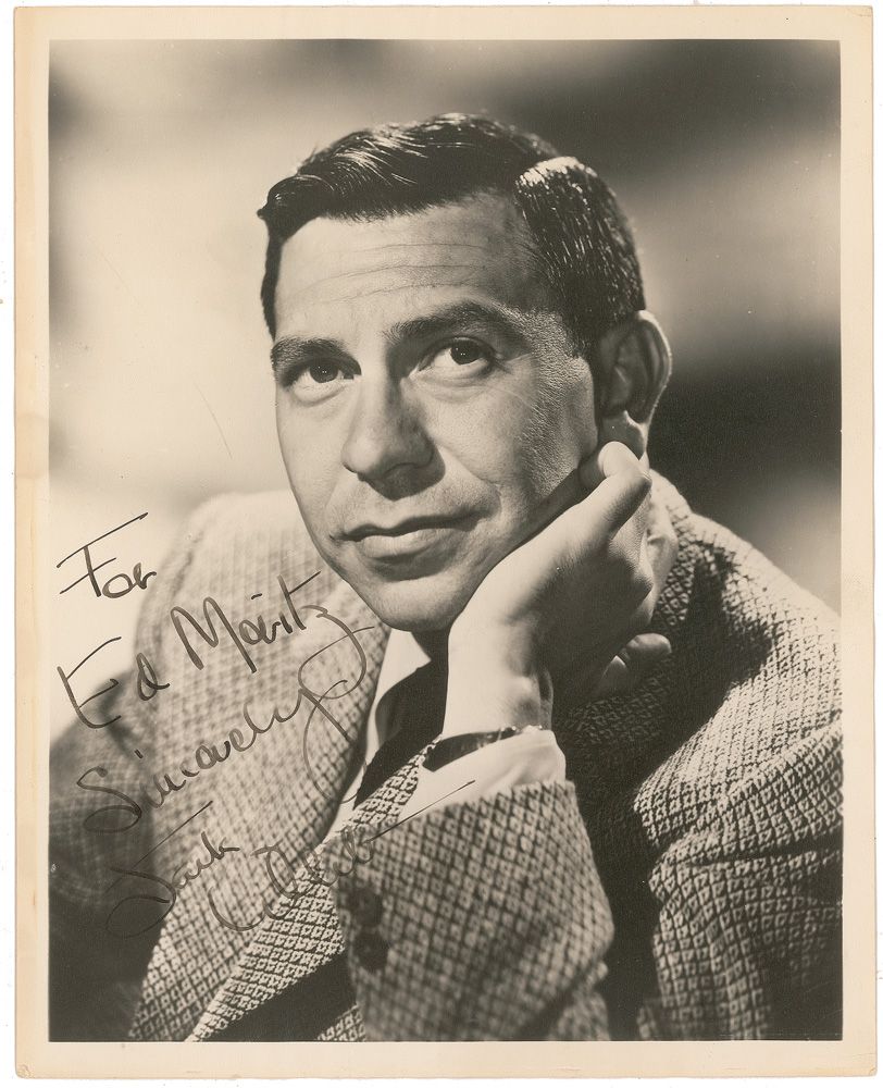 Vintage matte-finish 8 x 10 photo of Webb in a sport coat, signed and inscribed in fountain pen “For Ed Moritz, Jack Webb.” Some slight rippling to the top and bottom edges, a couple creases to corner tips, light damp staining to the left border, and mild silvering to dark areas of the image, otherwise fine condition.