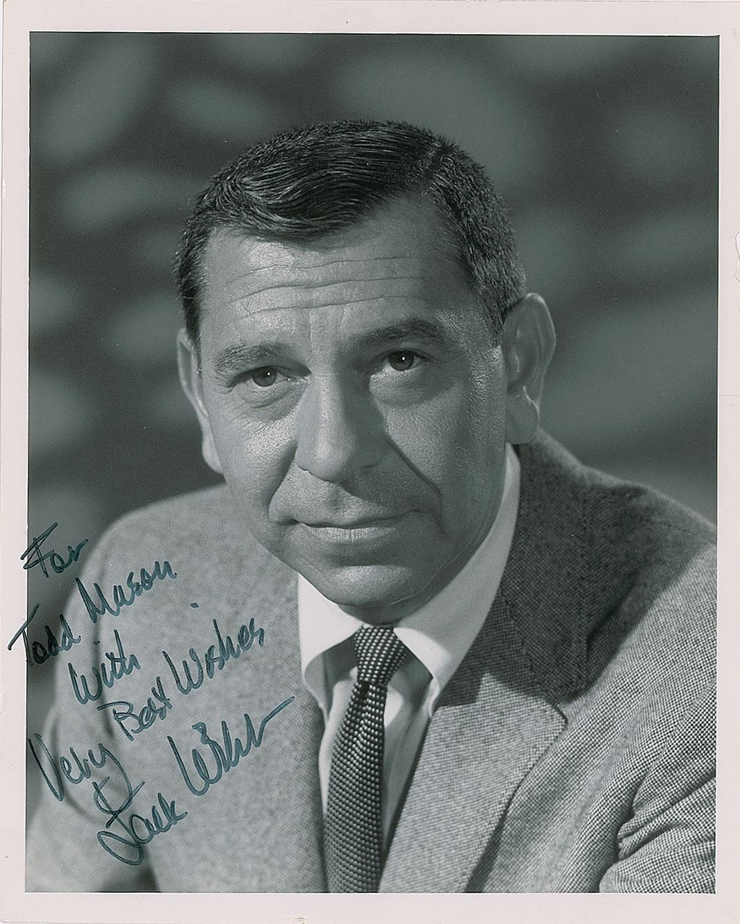 Glossy 8 x 10 photo of Webb in an up close pose, signed and inscribed in black felt tip, "For Todd Mason, with very best wishes, Jack Webb.” In fine condition, with a light paperclip impression to the top edge, and minor loss to the right border.