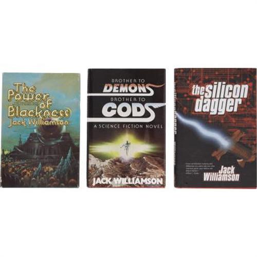 <B>Jack Williamson. Three First Editions</B></I>, including: <B><I>The Power of Blackness</B></I></B></I>. New York: G. P. Putnam's Sons [1976]. Octavo. 183 pages. Green cloth with gilt spine titles. Minor toning in the paper. Overall, book and dust jacket are near fine. [and:] <B><I>Brother to Demons, Brother to Gods</B></I></B></I>. New York: The Bobbs-Merrill Company [1979]. Octavo. 228 pages. Red binding with gilt spine titles. Overall, book and dust jacket are very fine. [and:] <B><I>The Silicon Dagger</B></I></B></I>. New York: Tom Doherty Associates [1999]. Octavo. 303 pages. Red binding with silver spine titles. Overall, book and dust jacket are very fine. <I>From the Robert and Diane Yaspan Collection.</B></I><BR><BR><b>Shipping:</b> Books & Catalogs (<a target="_blank" href="http://www.heritageauctions.com/common/shipping.php">view shipping information</a>)