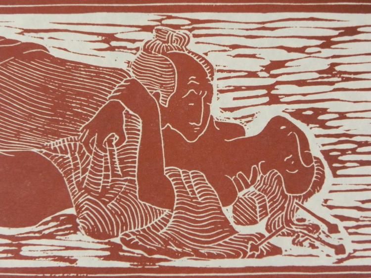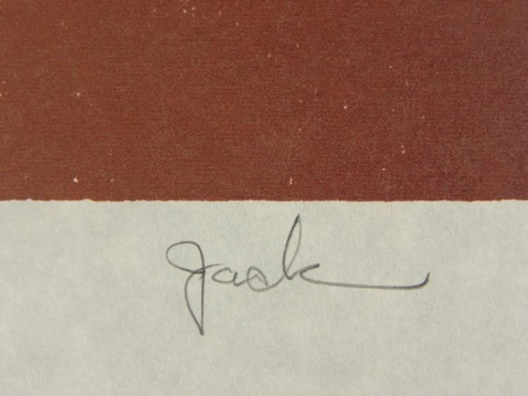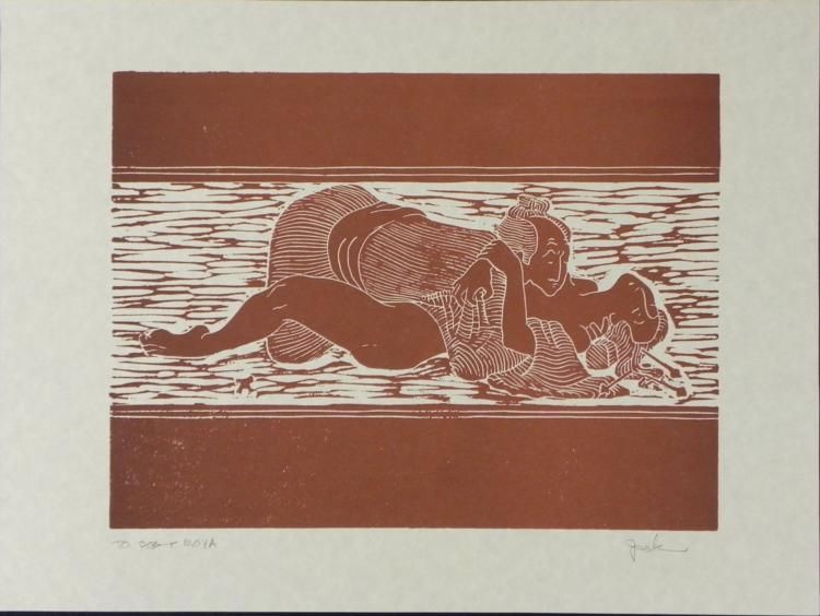 This woodcut portrays a couple engaged in an erotic act, done in a style reminiscent of the Japanese masters. Artist: JackSignature: Lower rightMedium: Woodcut on paperEdition: Trial ProofOther markings: Dedication to Bob & MoyaImage size: 9 x 12 inchesSheet size: 12 x 16 inchesCondition: Excellent