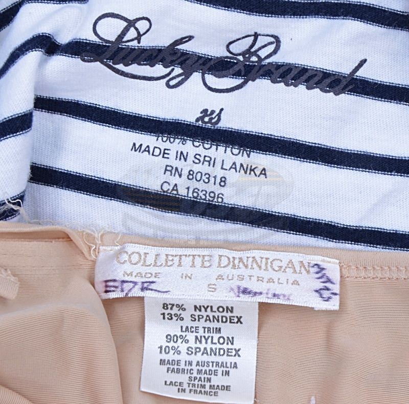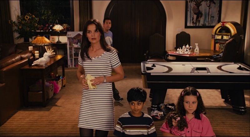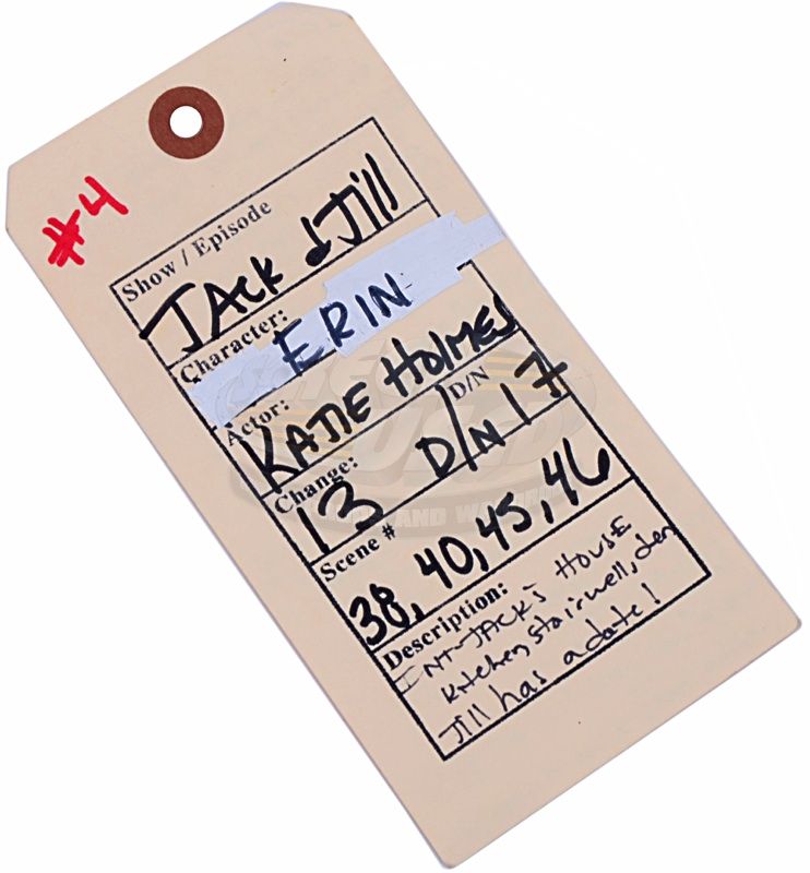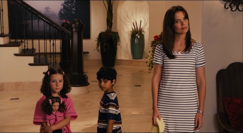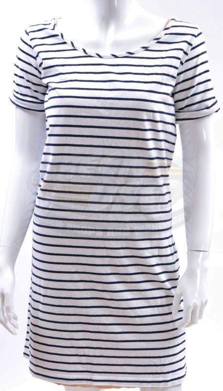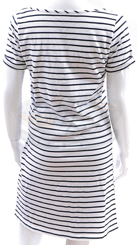 (Columbia Pictures, 2011) This outfit was acquired for the production for use by Katie Holmes as "Erin Sadelstein". The outfit consists of a horizontal stripe dress, a nude spaghetti strap slip, blue tights and a pair of flower earrings. Included with the outfit is a production used costume tag that details the entire outfit, change and scene numbers.
