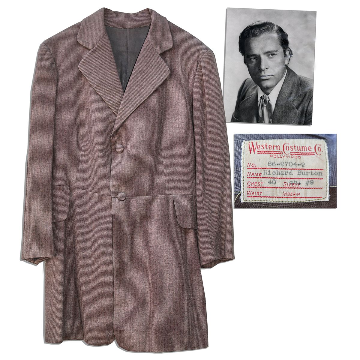 Pinstriped jacket worn by Academy-Award nominated actor Richard Burton in the 1955 period film ''Prince of Players''. Based on actual events, the film portrays 19th century Shakespearean actor Edwin Booth, played by Burton. Edwin Booth's acting expertise was overshadowed by the murderous exploits of his brother John Wilkes Booth, who assassinated Abraham Lincoln. Three-quarter length jacket in the 19th century style bears a label stitched into the inside pocket from Western Costume Co. with Burton's name typed and the size of the jacket as 40R. Near fine.
