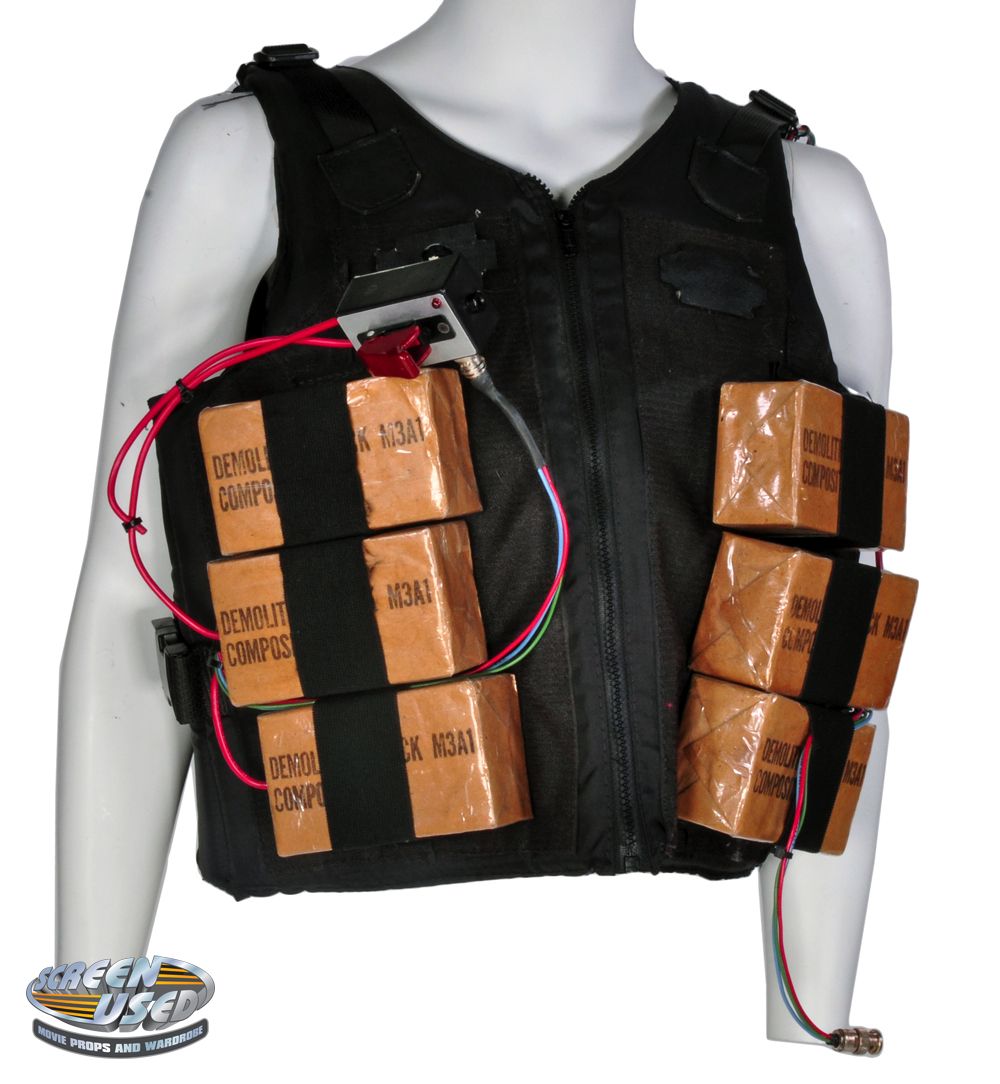 (New Line, 1998) This bomb vest was custom-made for the production for use by Jackie Chan as Hong Kong Detective Inspector Lee. The nylon vest features wiring, trigger and fake explosives attached. Some wires are cut/open ended as seen in the film and exhibits basic wear from use.