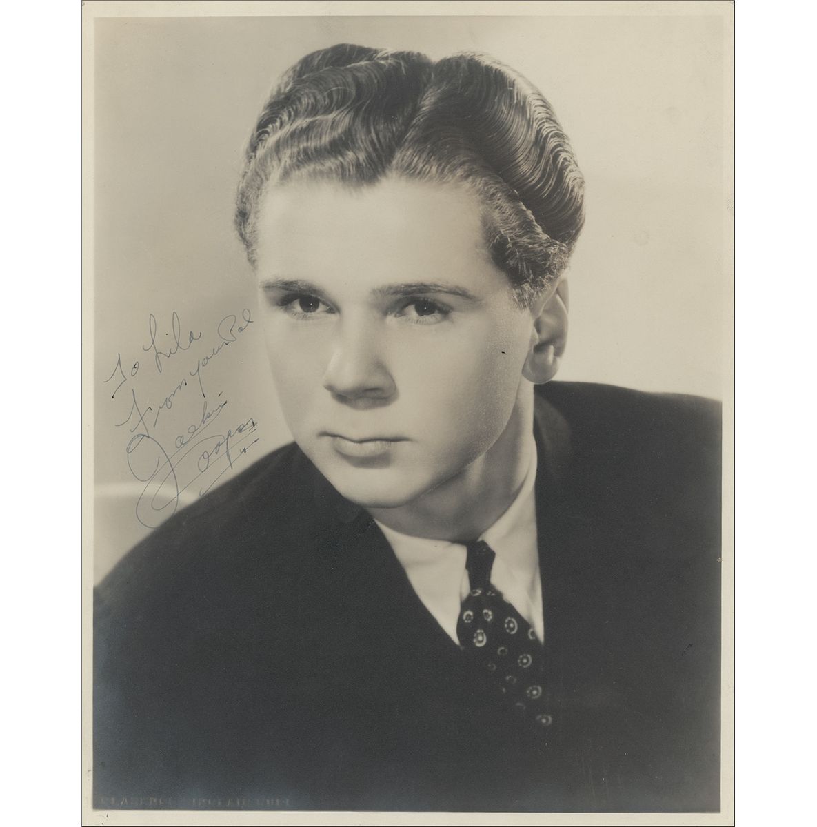 Vintage double-weight matte-finish 8 x 10 head-and-shoulders photo of a young Cooper, signed and inscribed in fountain pen, “To Lila, From your Pal, Jackie Cooper.” In fine condition, with a bit of light silvering.