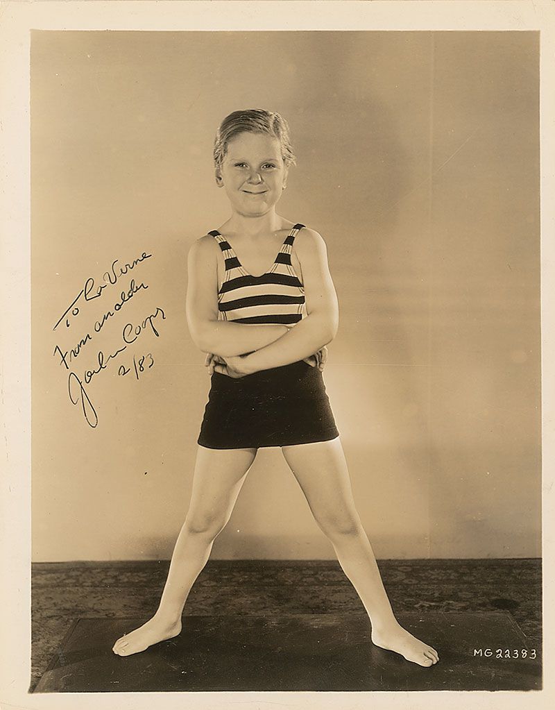 Vintage glossy 8 x 10 photo of a young Cooper in a bathing suit, signed and inscribed later in black ink, “To La Verne from an older Jackie Cooper 2/83.” Rippling to right edge and some other areas of rippling from mounting remnants to reverse, otherwise fine condition.