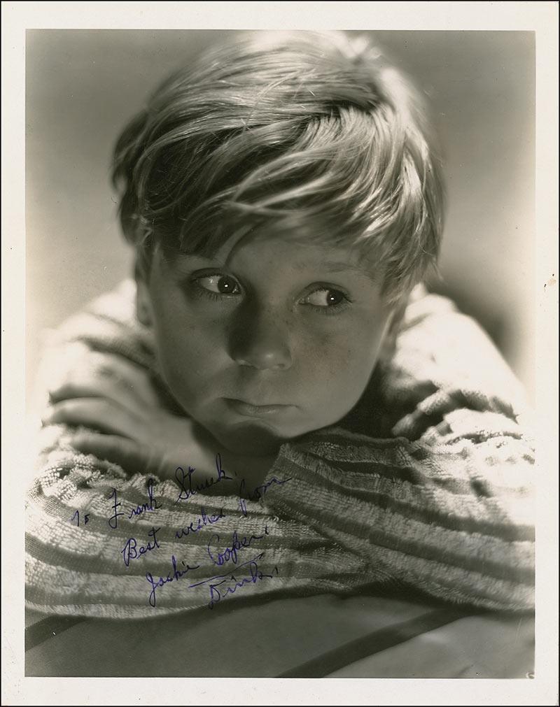 Vintage pearl-finish 8 x 10 photo from the 1935 film ‘Dinky,’ signed and inscribed in purple fountain pen “To Frank Sturck, Best wishes from Jackie Cooper, Dinky.” In fine condition, with scattered silvering to darker areas, visible only at an angle, and a couple light edge creases and spots.