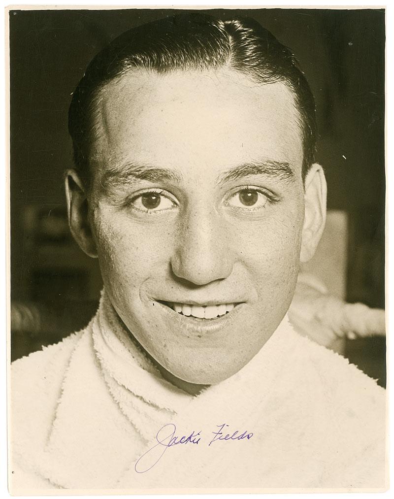Two-time World welterweight champion (1908–1984). Vintage glossy 7.5 x 9.75 close-up photo, signed in purple fountain pen. In very good condition, with lightly trimmed edges, scattered creases and surface impressions, a couple minor tack holes, and light vertical edge curling.