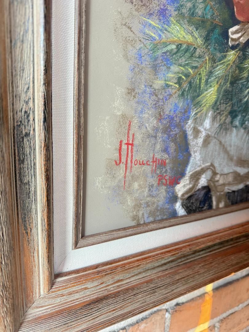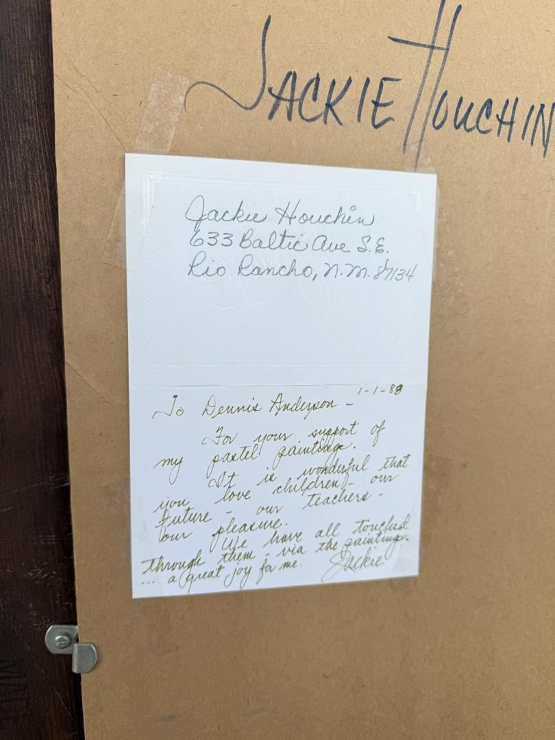 Title is Deer Dancer Cochiti Pueblo. Pastel on Masonite. 16" by 20" unframed, 22" by 26" framed. Jackie Houchin (20th century) was active/lived in New Mexico. Jackie Houchin is known for Figure, portrait.