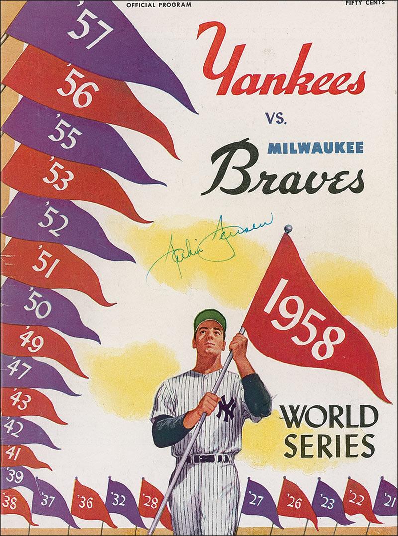 Football and baseball star who was the American League MVP with the Boston Red Sox in 1958. Vintage 1958 World Series program, 8.75 x 12, 47 pages, signed on the front cover in blue ink by Jensen. In fine condition. Pre-certified Steve Grad/PSA/DNA and RRAuction COA.